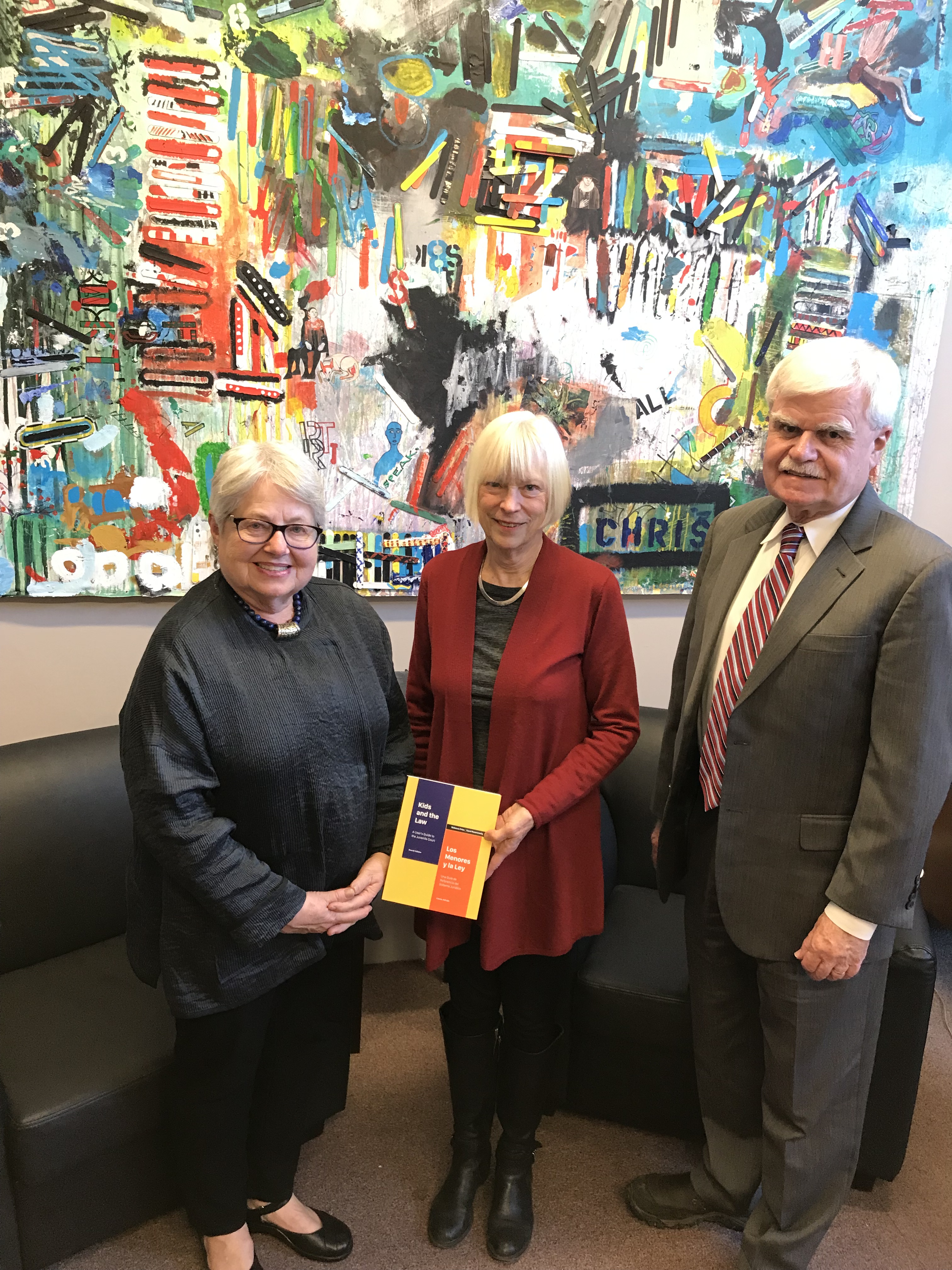 Standing in front of a painting by DYS Youth Artists, Representative Kay Khan, House Chair of the Committee on Children, Families, and Persons with Disabilities, met to discuss advocacy goals for FY2020 with Ed Brennan and Rebecca Pries.
